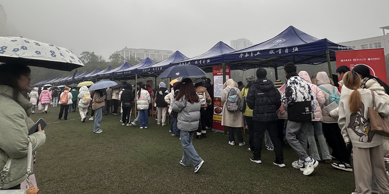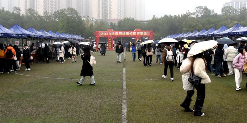 上午11点刚到,虽然还有些细雨蒙蒙,长江师范学院北苑行知体育场的中心区域,两排整齐的伞棚下,商家们已经摆好了展销品,三五成群的同学和老师们已陆陆续续前来“赶大集”。