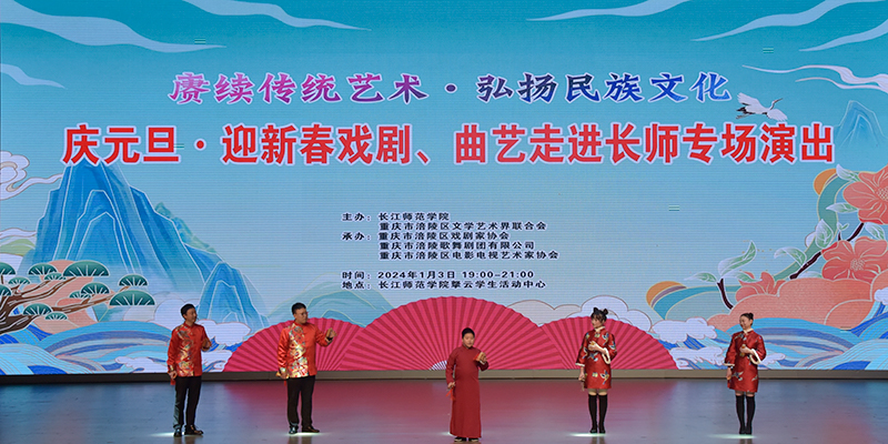 1月3日晚,以“赓续传统艺术 弘扬民族文化”为主题的戏曲专场节目在我校挐云学生活动中心精彩上演,现场师生共品了一场文化飨宴。本次活动由长江师范学院、重庆市涪陵区文学艺术界联合会主办,重庆市涪陵区戏剧家协会、重庆市涪陵歌舞剧团有限公司、重庆市涪陵区电影电视艺术家协会承办。