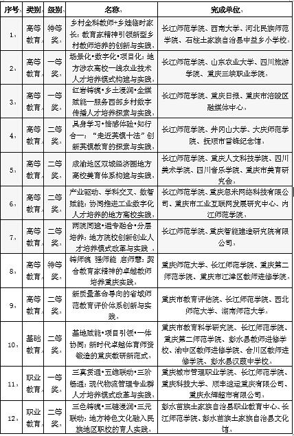 近日,重庆市人民政府公布了2025年重庆市教学成果奖获奖项目名单。我校共获得高等教育、基础教育、职业教育12项教学成果奖,获奖数量创历史新高。其中,学校作为第一完成单位共获得高等教育(本科)教学成果奖7项,包括特等奖1项、一等奖2项、二等奖4项,获奖数量在重庆市属高校中并列第。此外,学校与校外单位合作,参与获得2项高等教育(本科)教学成果奖(特等奖、二等奖各1项),2项职业教育教学成果奖(一等奖、二等奖各1项),1项基础教育教学成果二等奖。