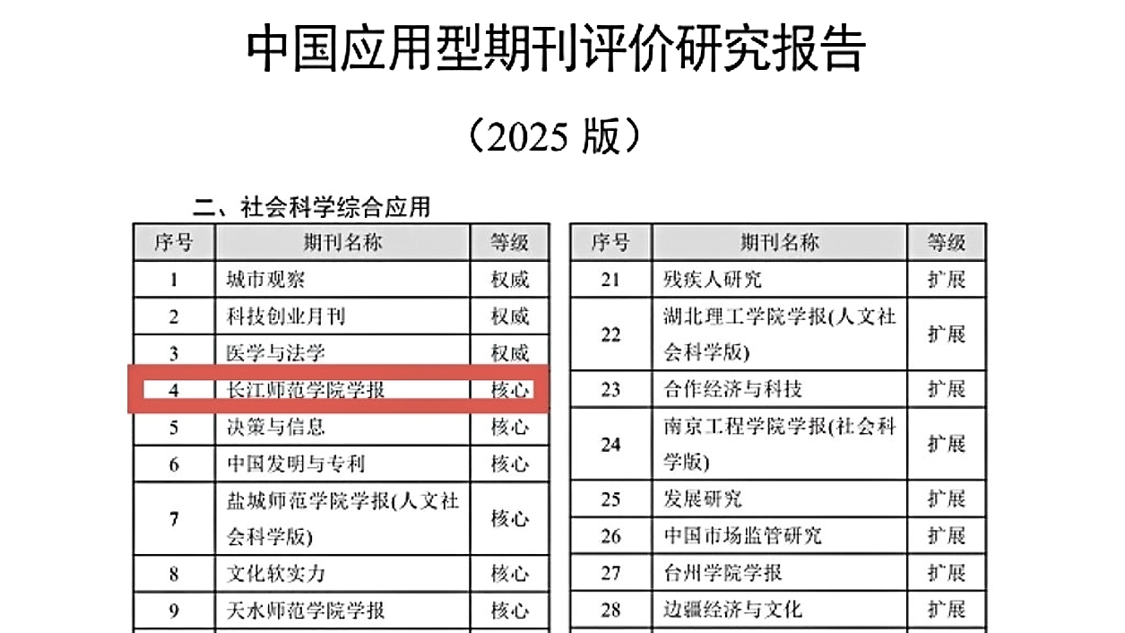《长江师范学院学报》在社会科学综合应用类40种期刊中位列4位,被评为CACJ中国应用型核心期刊。4月10日,武汉大学中国科学评价研究中心、武汉理工大学数字出版智能服务技术教育部工程研究中心联合发布《中国应用型期刊评价研究报告(2025版)》。《长江师范学院学报》参评应用型期刊,有利于发挥期刊的社会价值,实现“以评促建”“以评促改”,支持学校的应用型转型发展。