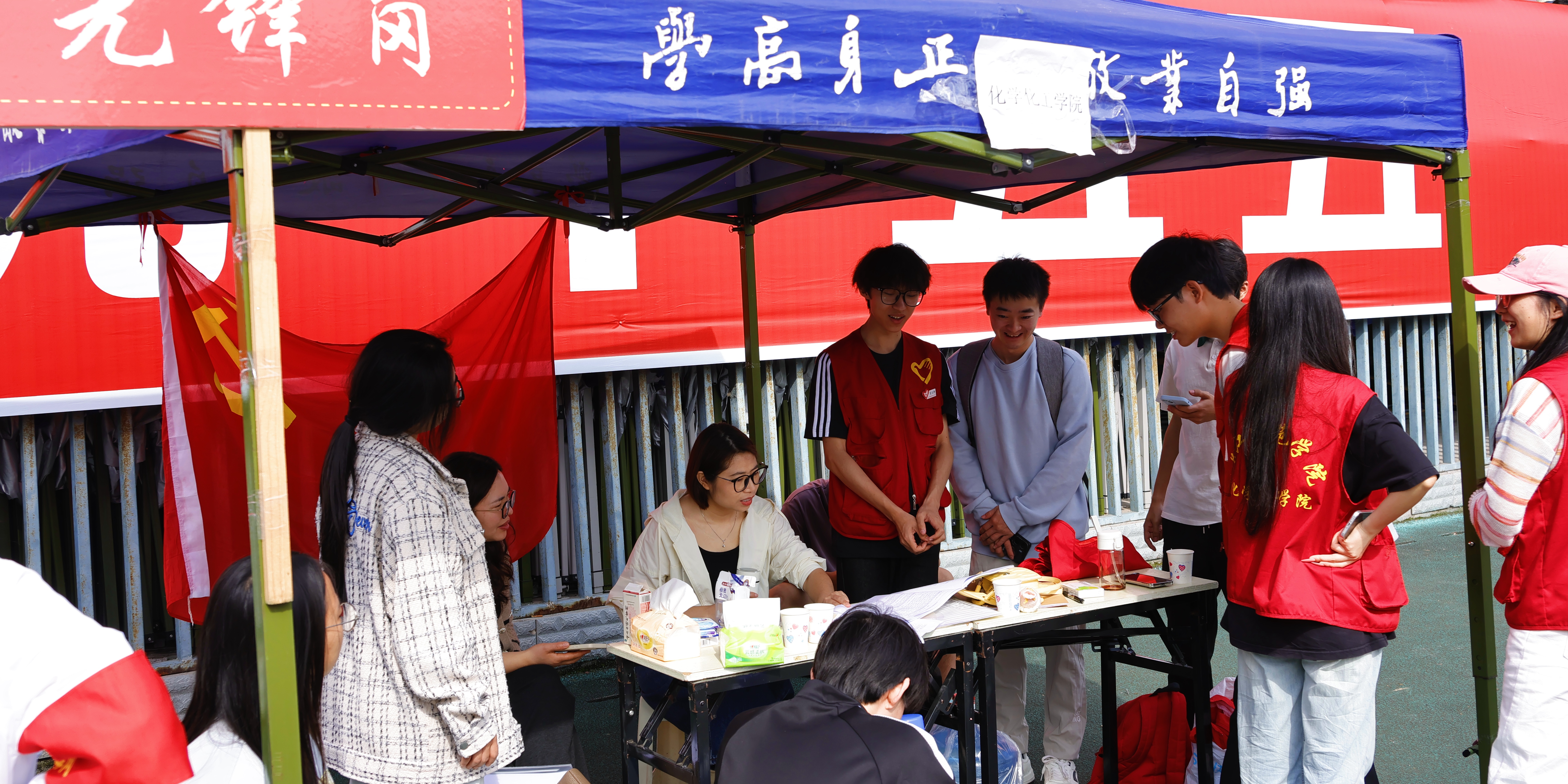 赛场的有序运转,离不开志愿者的付出。人文学院2025级学生李思葳同化工学院志愿者团队,承担了赛场布置、后勤服务等工作。李思葳坦言,烈日下的工作虽辛苦,但对志愿活动的热爱与责任感让她始终坚守;化工学院志愿者们提前规划、分工协作完成横幅布置等任务。