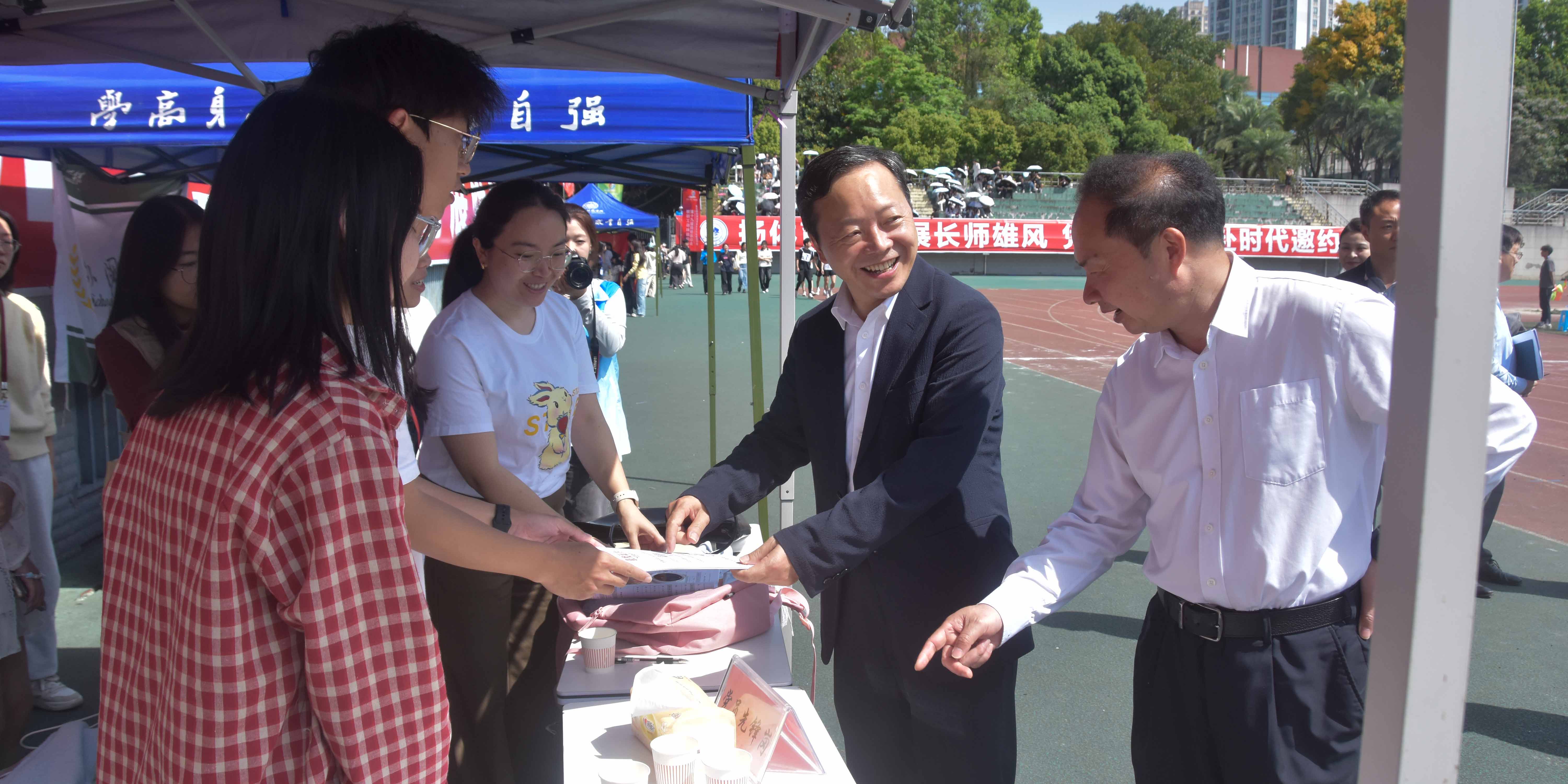 17日上午,党委书记黄大勇、校长孟小军来到行健体育场观赛指导,看望慰问正在赛场服务的志愿者团队,与师生亲切交流,为赛场健儿鼓劲打气、提振士气。