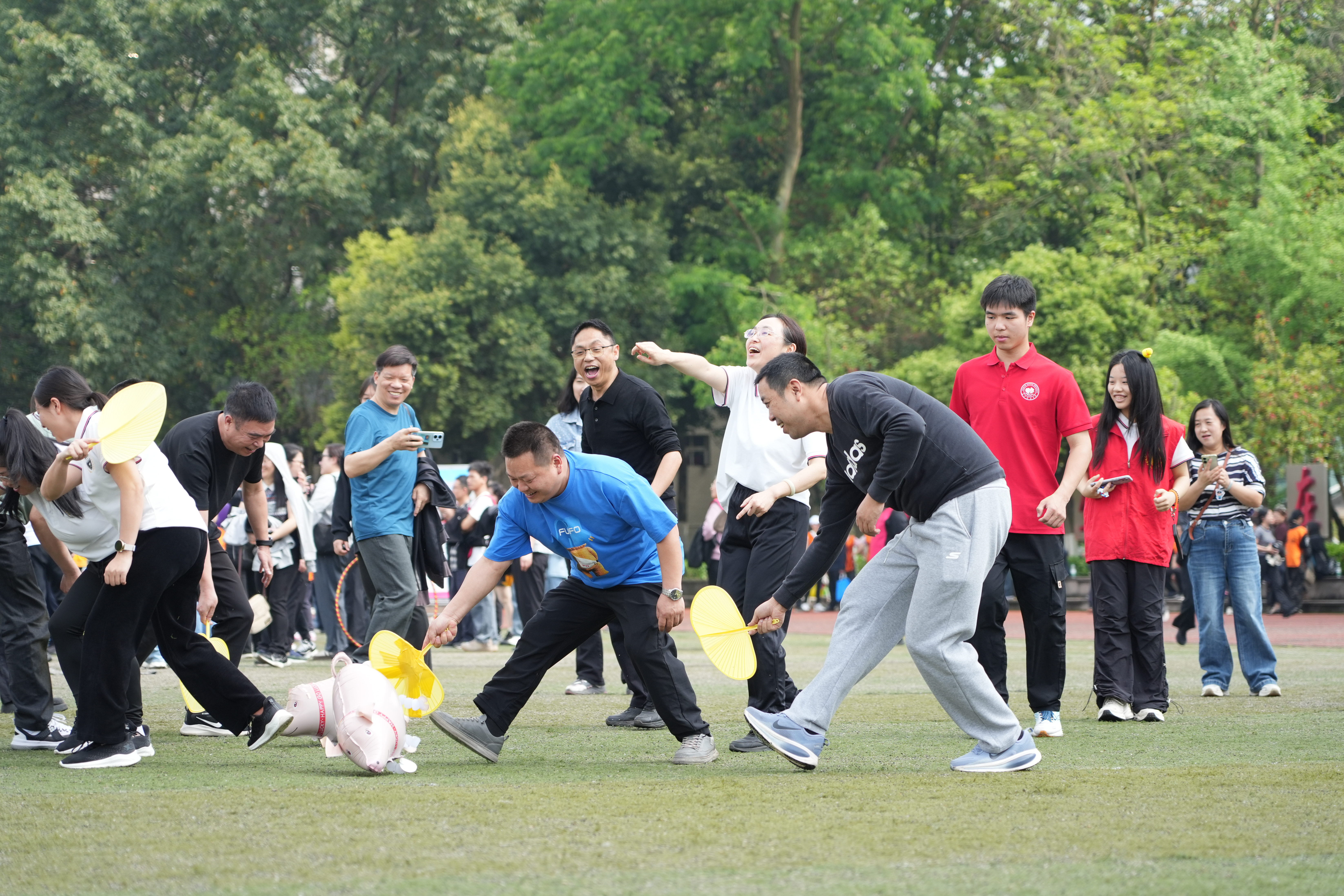 “赶猪回笼”赛场上妙趣横生,队员们手持黄扇,俯身弯腰,小心翼翼地追逐驱赶充气小猪。绿茵场上,憨态可掬的“小猪”左右晃摆,老师们或堵或赶,一招一式惹得场边笑声连连、喝彩不断。